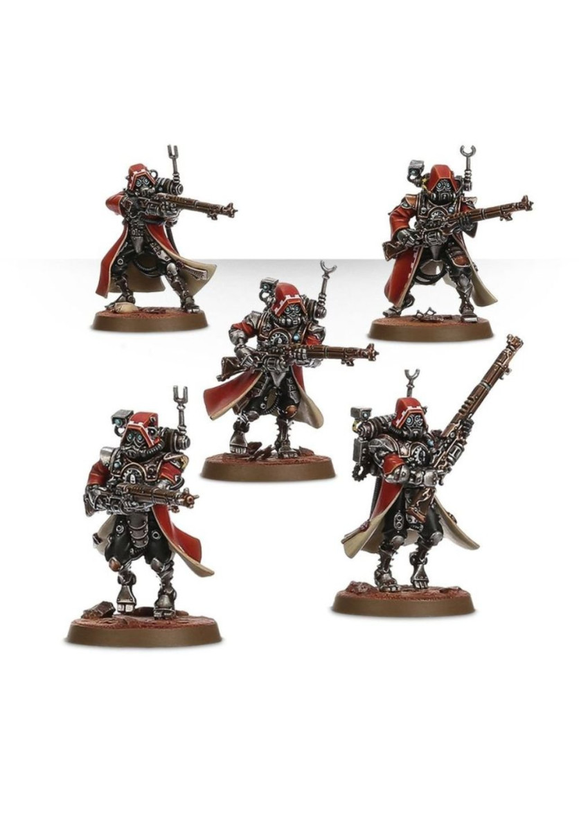 La unidad puede incluir un Alpha, armado con una pistola voltáica o radium y un arma de cuerpo a cuerpo (que puede ser una espada de energía una vara taser o una maza voltáica) y tres miniaturas pueden usar armas especiales. Tienes disponible un arcabuz transuránico, un rifle voltaico, y un caliver de plasma. Este último incluye una cabeza y mochila específica. Una miniatura se puede convertir en Alpha y usar una cadena de datos mejorada o un omnispex, la caja muestra realmente la naturaleza obsesiva a la hora de recoger datos del Adeptus Mechanicus.