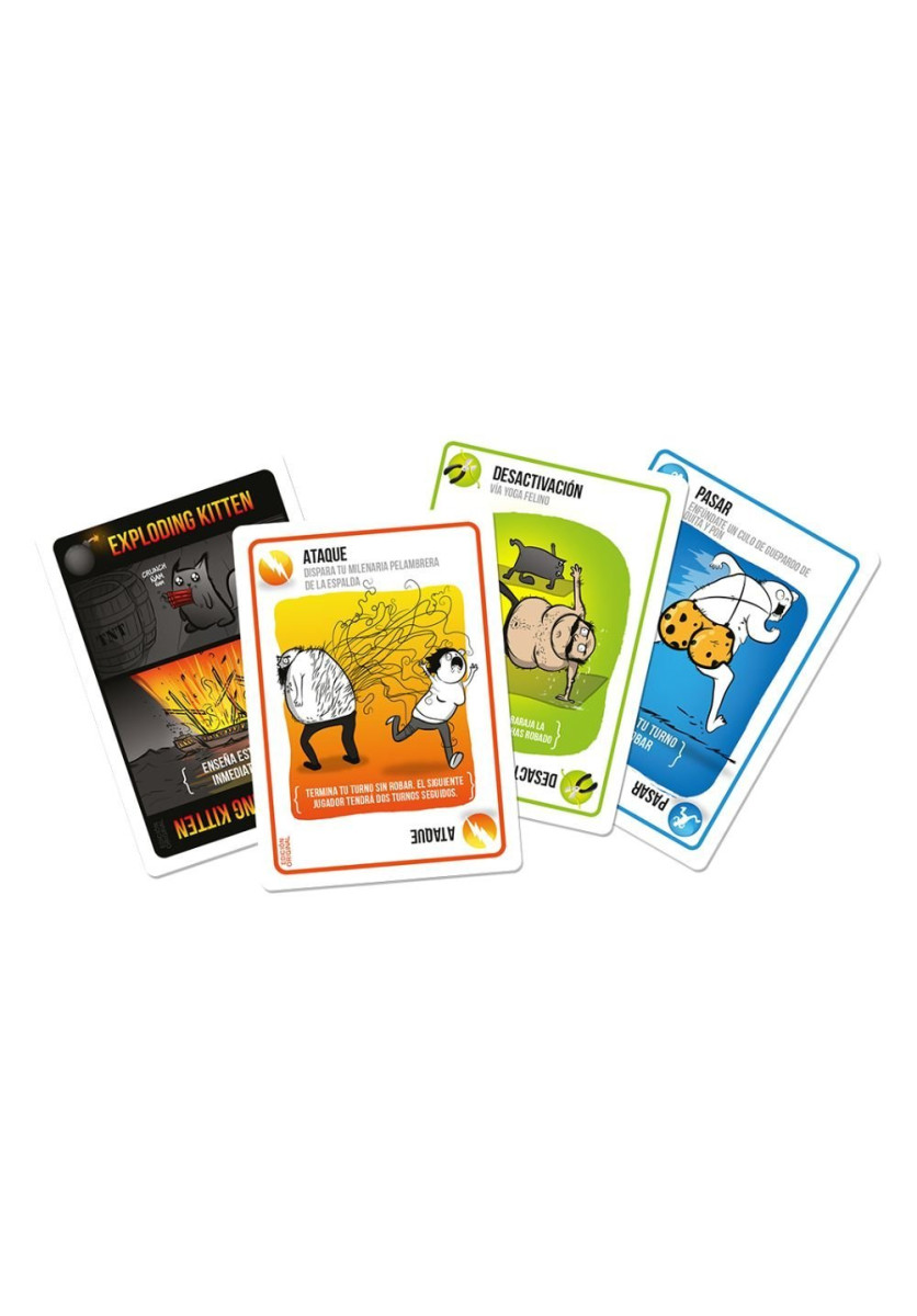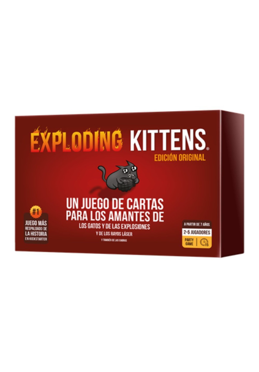Se trata de una versión gatuna de la ruleta rusa con un gran componente estratégico. Los jugadores van robando cartas hasta que a alguien le sale un Exploding Kitten. Cuando esto sucede, esa persona muere y queda eliminada de la partida (a no ser que tenga una carta de Desactivación, que permite desactivar al Exploding Kitten con armas como punteros láser, friegas de barriga o bocatas de menta gatuna). El resto de las cartas de la baraja sirven para cambiar de lugar, mitigar o evitar a los Exploding Kittens.